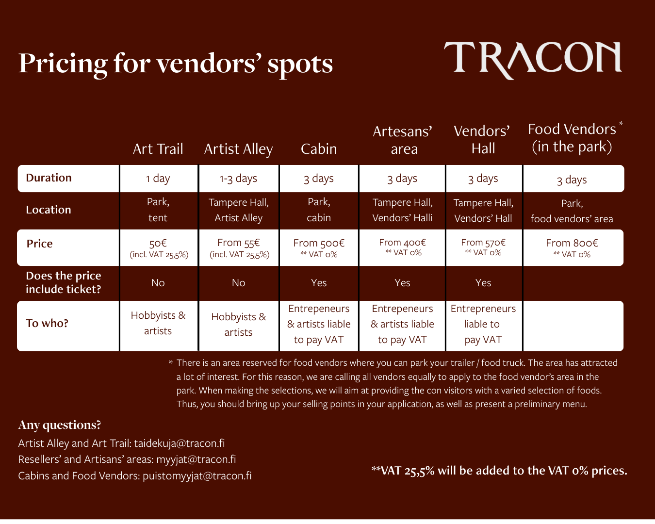 Resellers’ and Artisans’ Areas: myyjat[at]tracon.fi